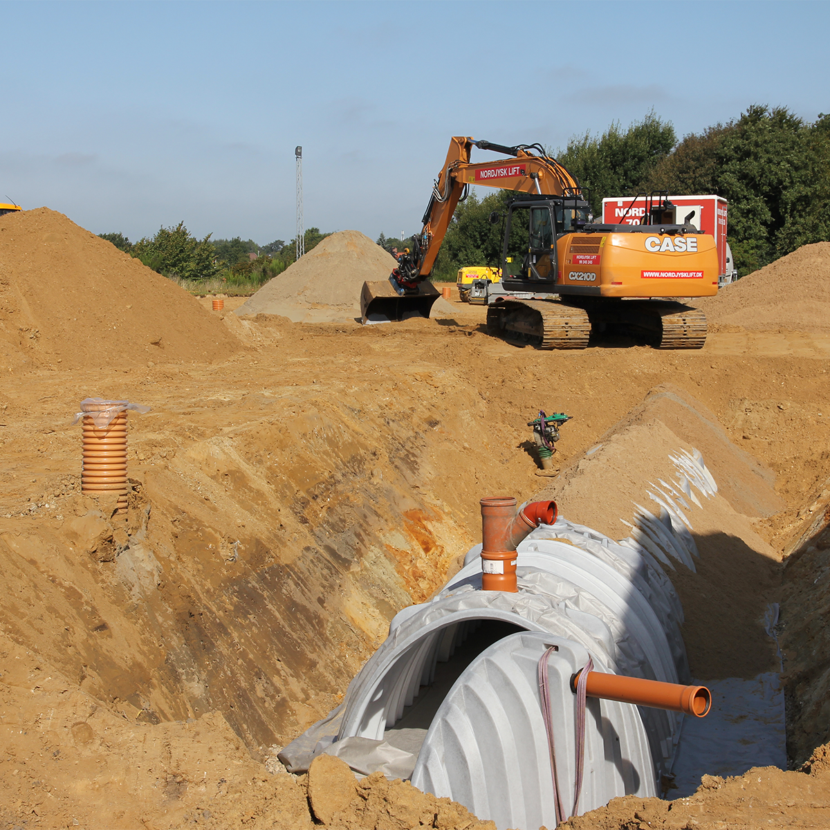 Bo roser WaterCare for at udvikle produkter med tanke på fremtiden og de udfordringer, vi står overfor med stigende regnmængder. Selvom det var første gang, Bo stiftede bekendtskab med WaterCares Faskinetunnel, var han imponeret over, hvor simpelt og nemt systemet var, og han følte, at der kun var behov for kort vejledning. “Effektivisering af arbejdsgangen var en stor fordel, hvor modulerne hurtigt og nemt blev løftet ned i udgravningen ved maskinløft i de indstøbte løfteøjer og samlet med gravemaskinen.”