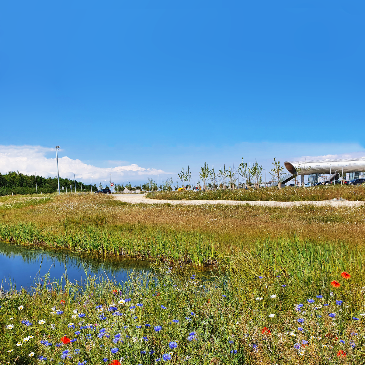 Det løses ved installation og brug af en finpartikeludskiller. Regn- og overfladevand fra parkeringsare­alet renses effektivt igennem anlægget, som er skjult under vilde blomster i det nærliggende grønne område. Herefter kan det rensede overfladevand føres videre til det følsomme re­cipient Snogebækken med god samvittighed og uden fare for forurenede natur- og vandmiljøer.