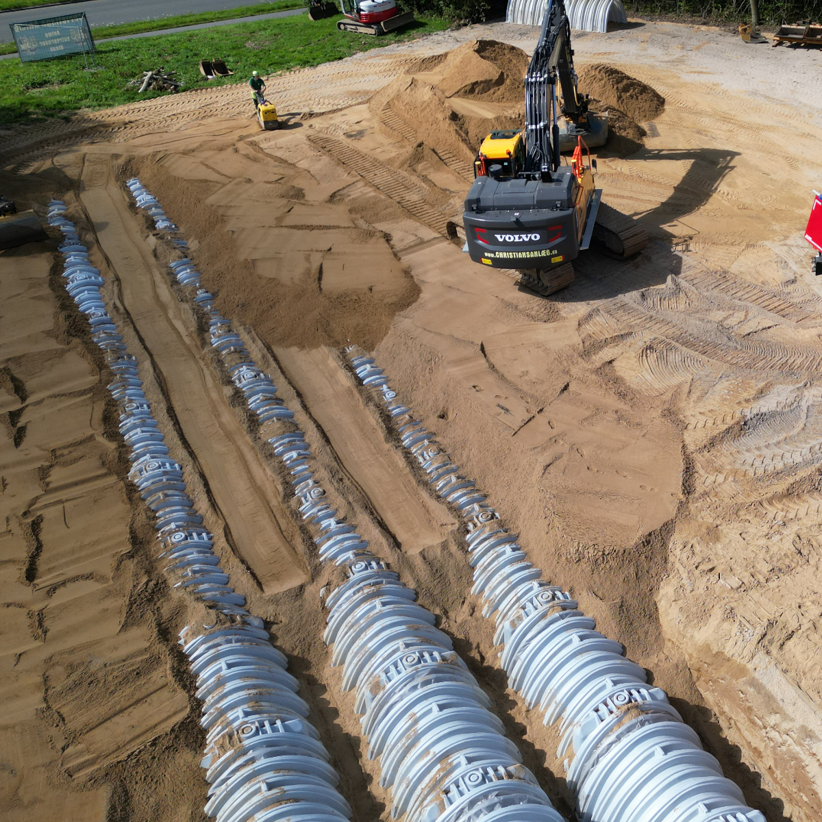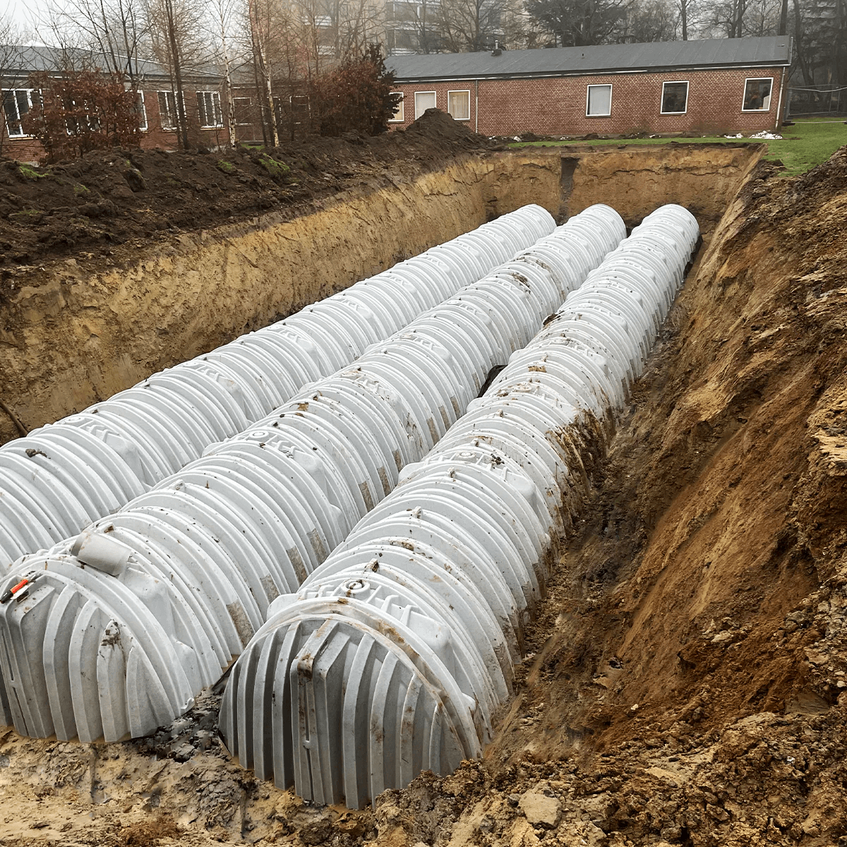 nedsivningen foregår i modulopbyggede faskiner, til større installationer i boligområder og erhvervsbyggerier, hvor der kan være behov for flere hundrede meter faskinetunneler eller en løsning i rør. Vores systemer er modulopbyggede og kan installeres både i dybden og bredden afhængigt af pladsforhold. Alle løsninger tilpasses kravene til lokal afledning af regnvand (LAR) og kan kombineres med forbehandlingsmoduler som sandfang eller olieudskillere efter behov. Vi tilpasser anlæggene så de passer lige til jeres behov.